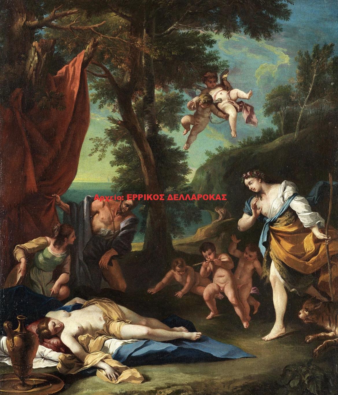On the horizon, a calm body of water reveals the proximity of the shore to the scene in the foreground, in which a young man rushes from the right to a young woman lying on the ground under a red canopy on the left. Several figures and putti complete the scene.