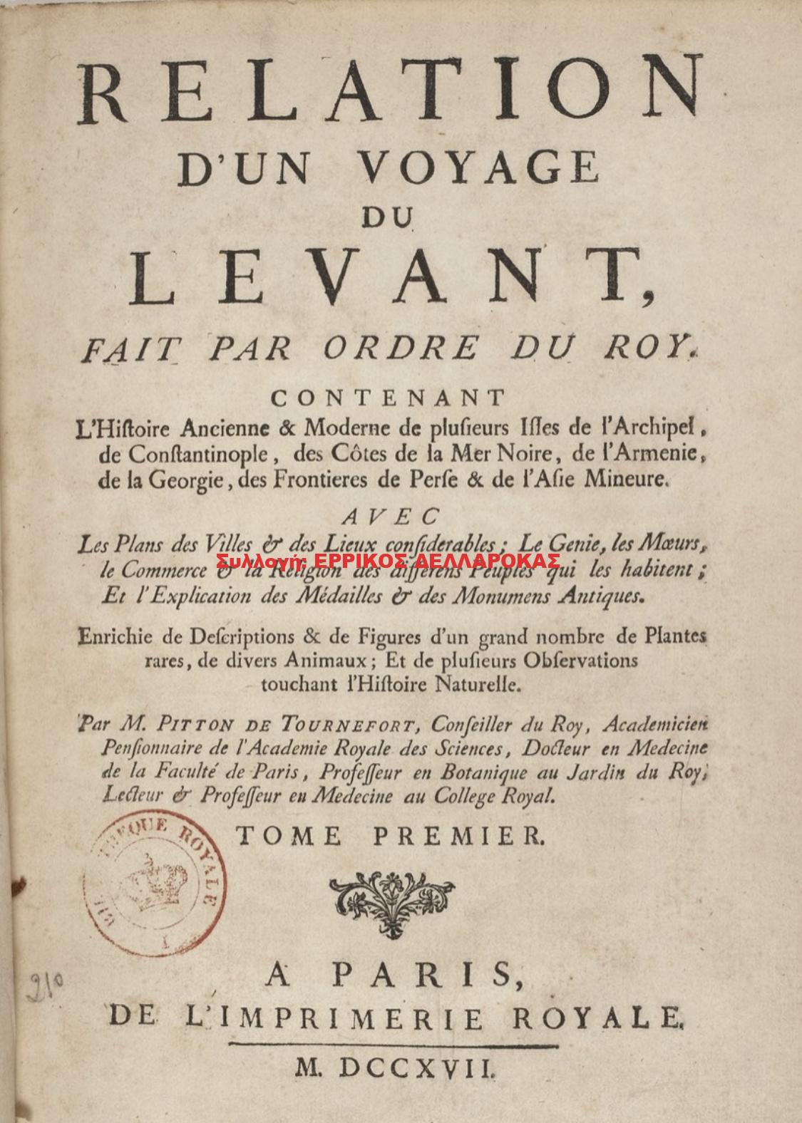 TOURNEFORT, Joseph Pitton de. Relation d’un Voyage du Levant, fait par ordre du Roy. Contenant l’histoire ancienne & moderne de plusieurs Isles de l’Archipel, de Constantinople, des côtes de la Mer Noire, de l’Armenie, de la Georgie, des frontières de Perse & de l’Asie Mineure. Avec les plans des villes & des lieux considérables…, vol. Ι, Paris, Imprimerie Royale, M.DCCXVII [=1717].