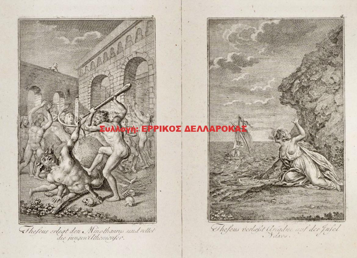 At the lower part signed in the printing plate: “Cl. Kohl sc MI?]”. At the lower part inscribed in the printing plate: “Theseus slays the Minotaur and saves the young Athenians | Theseus leaves Ariadne on the island of Naxos.” Date: