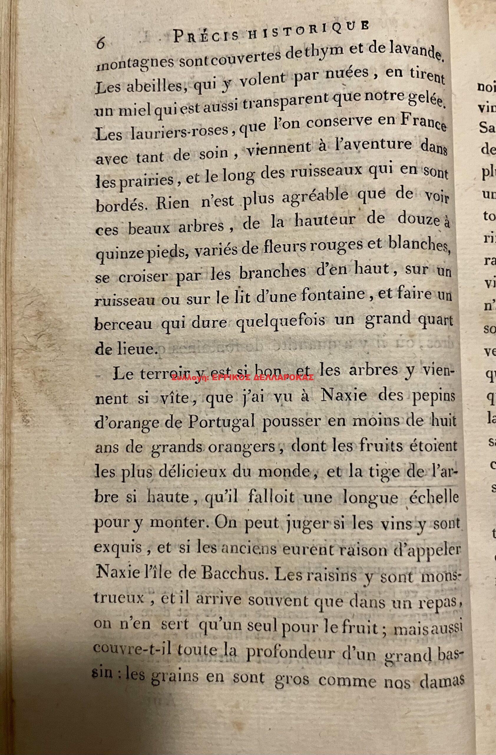 Subsequently, Della Rocca deals with the geography of the island. In his historical overview, which shows the depth of his knowledge, he collates ancient testimonies and contemporary facts (place names, antiquities, products, longevity of the locals, legends etc.), and dedicates a whole chapter to an “astronomical monument on the island”, that is, Ferecydes’ cave. Subsequently, Della Rocca presents the contemporary island, by citing and discussing extracts from the work of Joseph Pitton de Tournefort (1717). In a very polished narrative. The author constructs a comprehensive picture of the island, drawn by an insider. Descriptions alternate with personal views and evaluations. Thus, realities and behaviours are brought to life against the Cycladic landscape.
