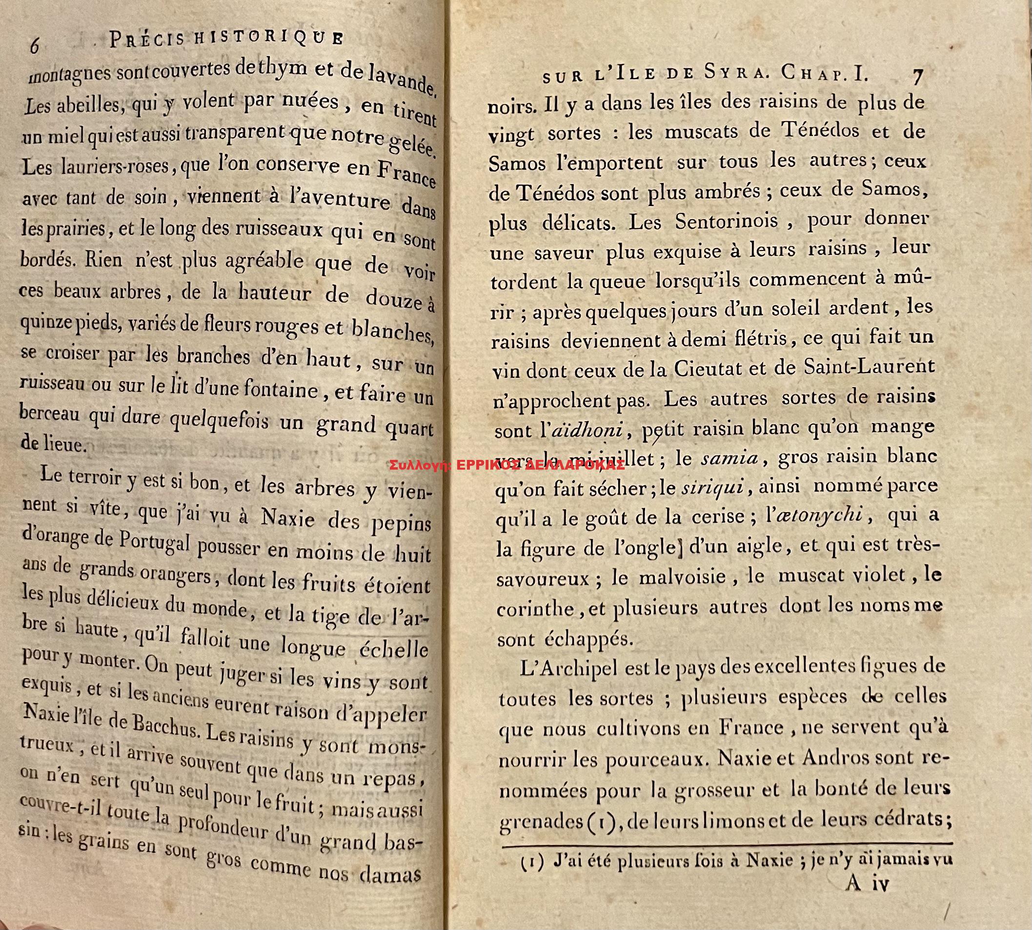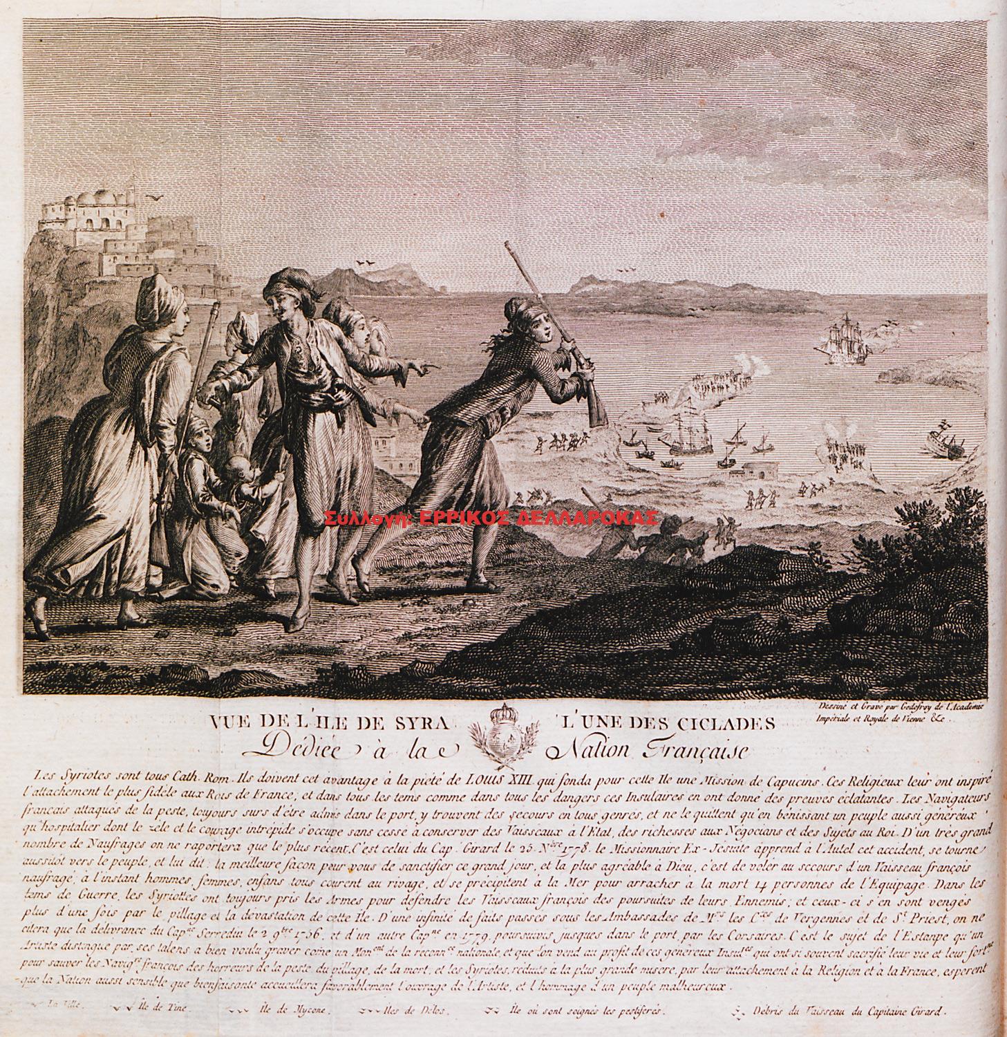 Della Rocca wrote a three-volume work of 1320 pages. He dedicates two hundred and nintey pages to Syros, accompanied by a few engravings, of uncommon and interesting subjects. He deals with the history, administration and economy of the island in twelve chapters. First, he offers interpretations on the phenomenon of the genius of the Greeks, which are followed by a general introduction on the Cyclades (climate, flora, fauna and famed products), and the special inclinations of the inhabitants.