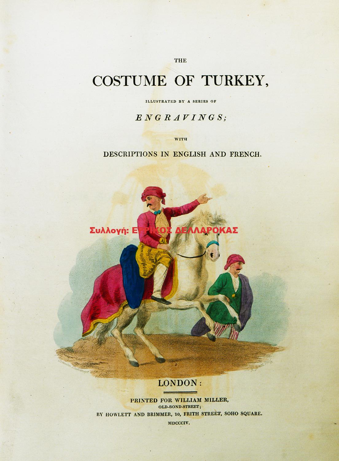 According to the prologue to this edition, he travelled during four years (starting in 1796), always drew from nature, and was in Athens in 1797. This elegant work was first published in 1802, and again in 1818 and 1820. It includes sixty drawings of human types from the Ottoman empire. The explanatory texts, in English and French, are based on extracts from works by B. De Tott, J. Dallaway, G.A. Olivier, M. Montague, J. Pitton de Tournefort, Μ. d’Ohsson and others.