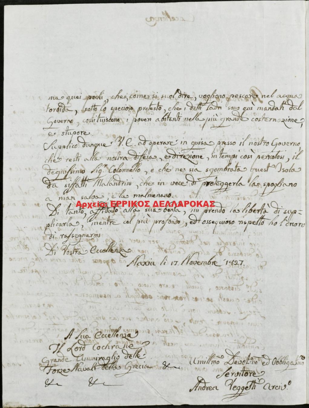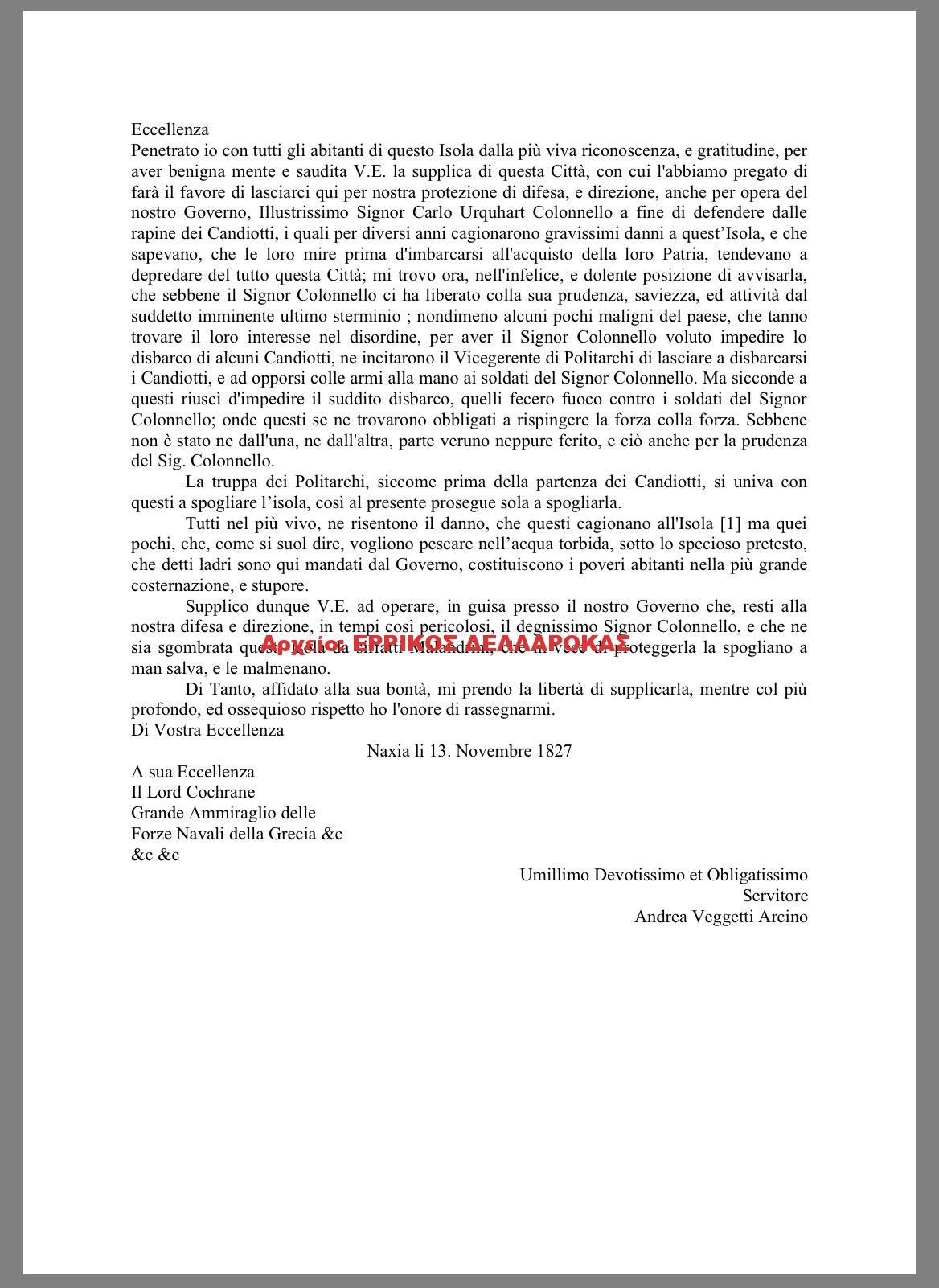 13 Νοεμβρίου 1827: Ο Andrea Veggetti Arcino επαινεί τη διοίκηση του David Urquhart και τις προσπάθειές του να προστατέψει τους κατοίκους της Νάξου από τις λεηλασίες των Κρητικών. Κάποιοι συνέστησαν στον υπαρχηγό των πολιταρχών να επιτρέψει την αποβίβαση στο νησί Κρητικών με αποτέλεσμα να προκληθεί σύρραξη, ευτυχώς χωρίς θύματα. Τον παρακαλεί να παραμείνει ο Urquhart ώστε να εγγυηθεί τη διατήρηση της τάξης στο νησί.