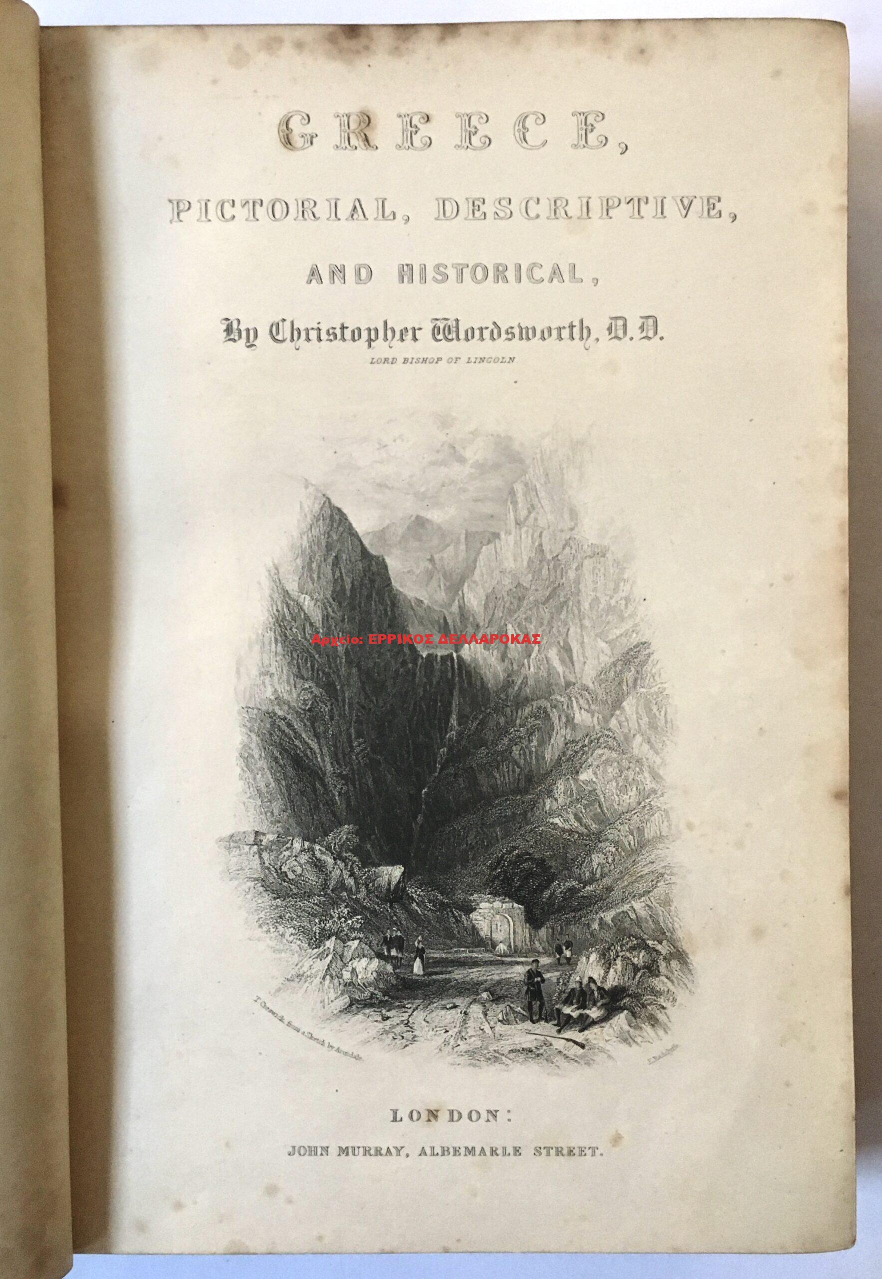 WORDSWORTH, Christopher. Greece pictorial, descriptive, & historical by Christopher Wordsworth, D.D. Lord Bishop of Lincoln, with numerous Engravings illustrative of the Scenery, Architecture, Costume, and Fine Arts of that Country and a History of the Characteristics of Greek Art by George Schraf, F.S.A. Director, Keeper, and Secretary of the National Portrait Gallery. A New Edition revised. With Notices of recent Discoveries by H.F. Tozer, M.A. Fellow and Tutor of Exeter College, Oxford, Author of the “Highlands of Turkey”, “Lectures on the Geography of Greece”, London, John Murray, 1882.