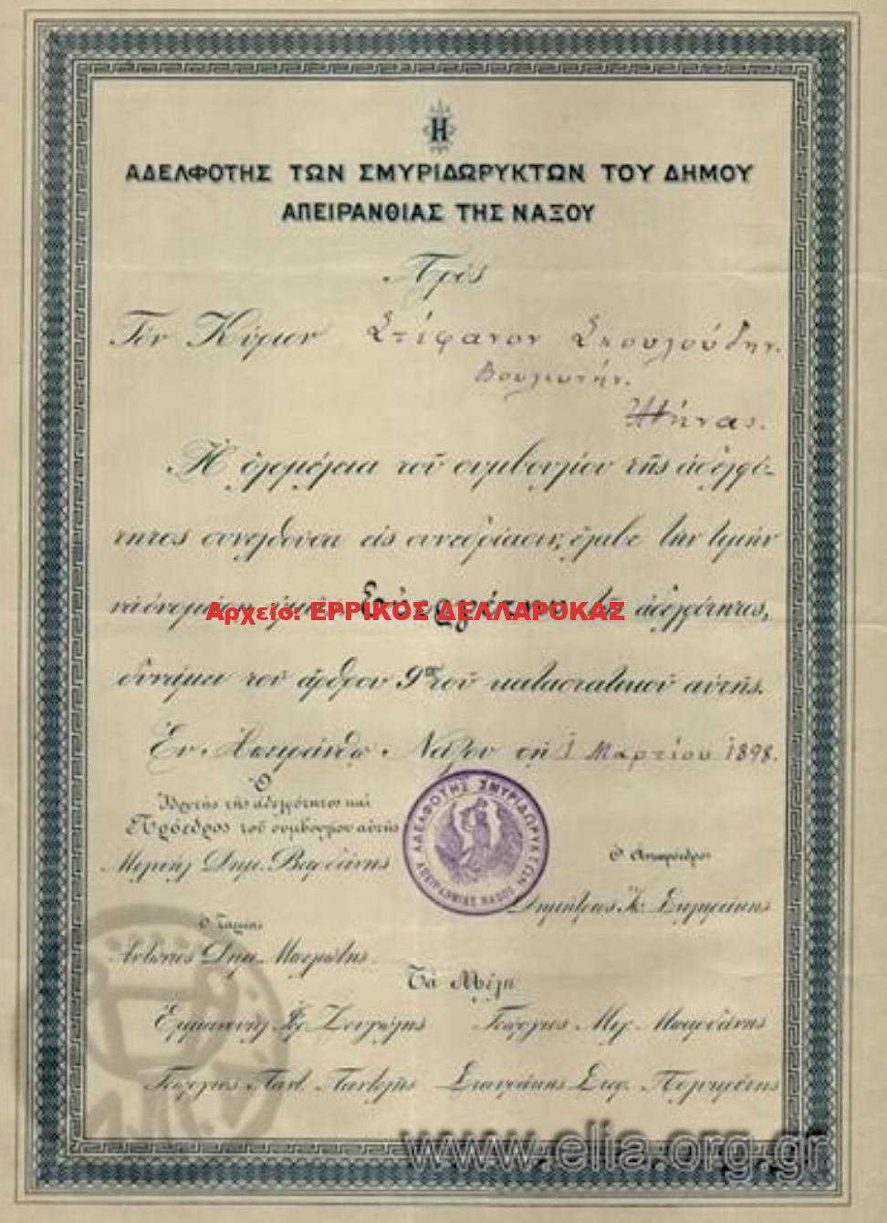 1898 ΑΔΕΛΦΟΤΗΣ ΣΜΥΡΙΔΩΡΥΚΤΩΝ ΤΟΥ ΔΗΜΟΥ ΑΠΕΙΘΡΑΝΘΙΑΣ ΤΗΣ ΝΑΞΟΥ