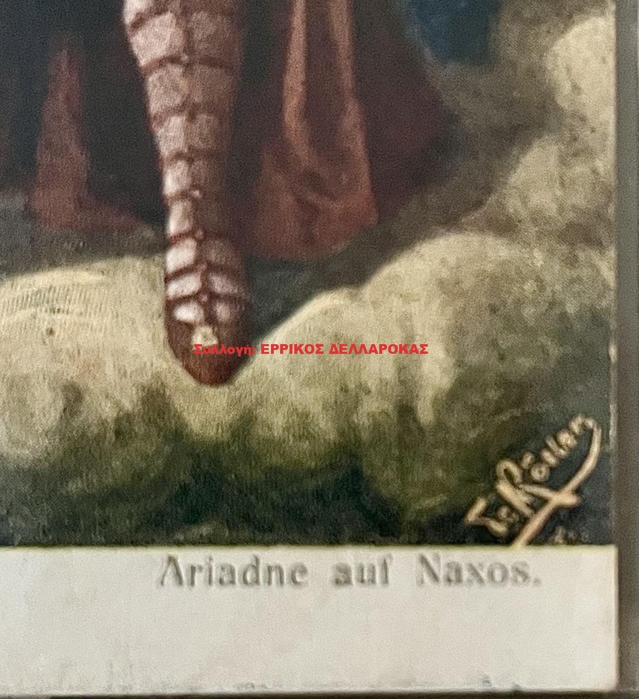 Η κάρτα απεικονίζει τη συνάντηση της Αριάδνης με τον θεό Διόνυσο (Βάκχο) στο νησί της Νάξου. Στο κάτω μέρος αναγράφεται ο τίτλος “Ariadne auf Naxos” και το όνομα του συνθέτη “Strauss”.